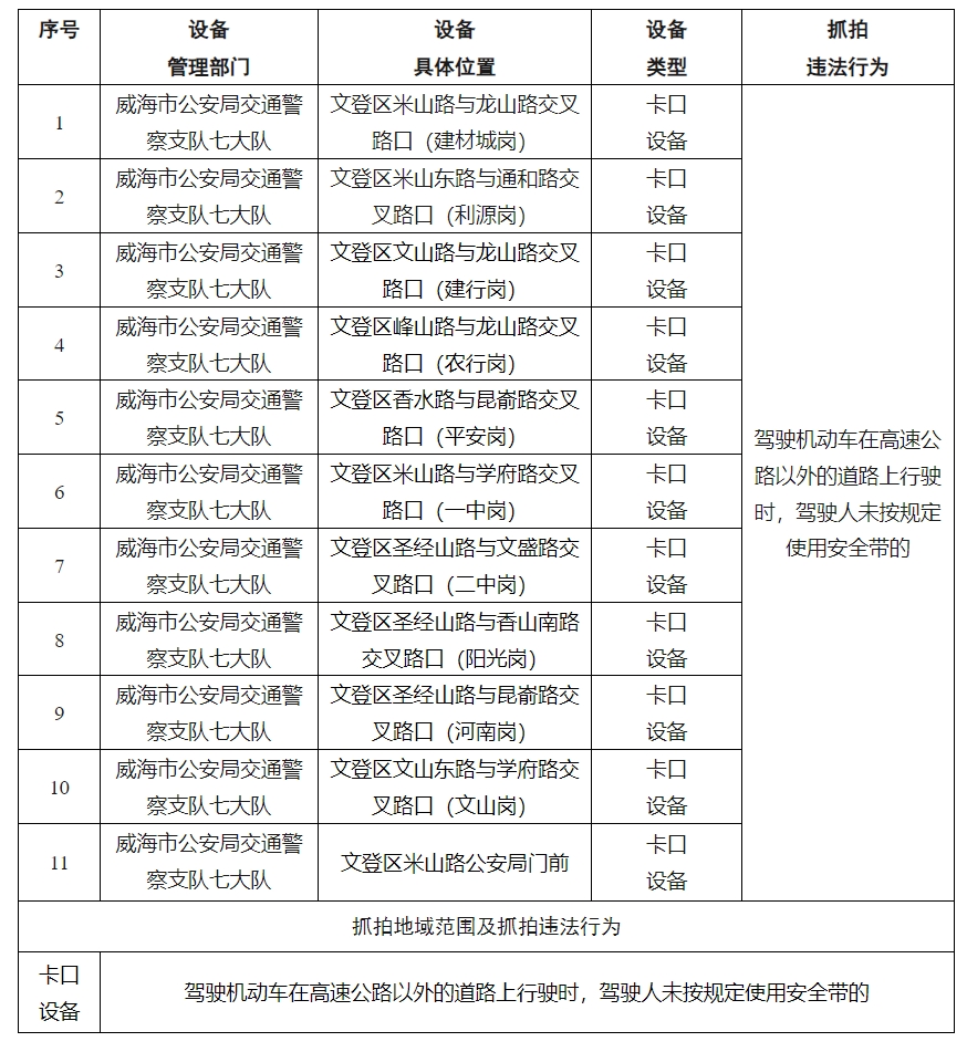 為保證道路交通安全,預防和減少交通事故的發(fā)生,根據(jù)《中華人民共和國道路交通安全法》及其實施條例等法律法規(guī)和相關技術規(guī)范的規(guī)定,依據(jù)《公安機關執(zhí)法公開規(guī)定》,現(xiàn)將文登區(qū)啟用的11處共11個交通技術監(jiān)控設備予以公示,自4月9日起,將對有關交通違法行為進行依法管理,請廣大交通參與者自覺遵守道路交通法律法規(guī),共同維護良好的道路交通環(huán)境。