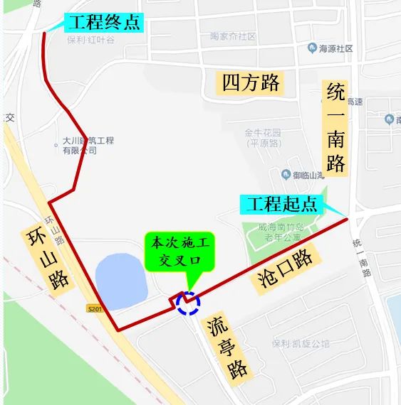 三、通行方案:施工期間,流亭路與滄口路交叉口南側(cè)道路封閉,在原有道路南側(cè)修筑便道,滿(mǎn)足車(chē)輛雙向兩車(chē)道通行。施工期間便道兩側(cè)禁止停車(chē)。
