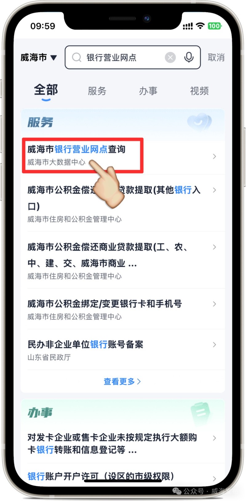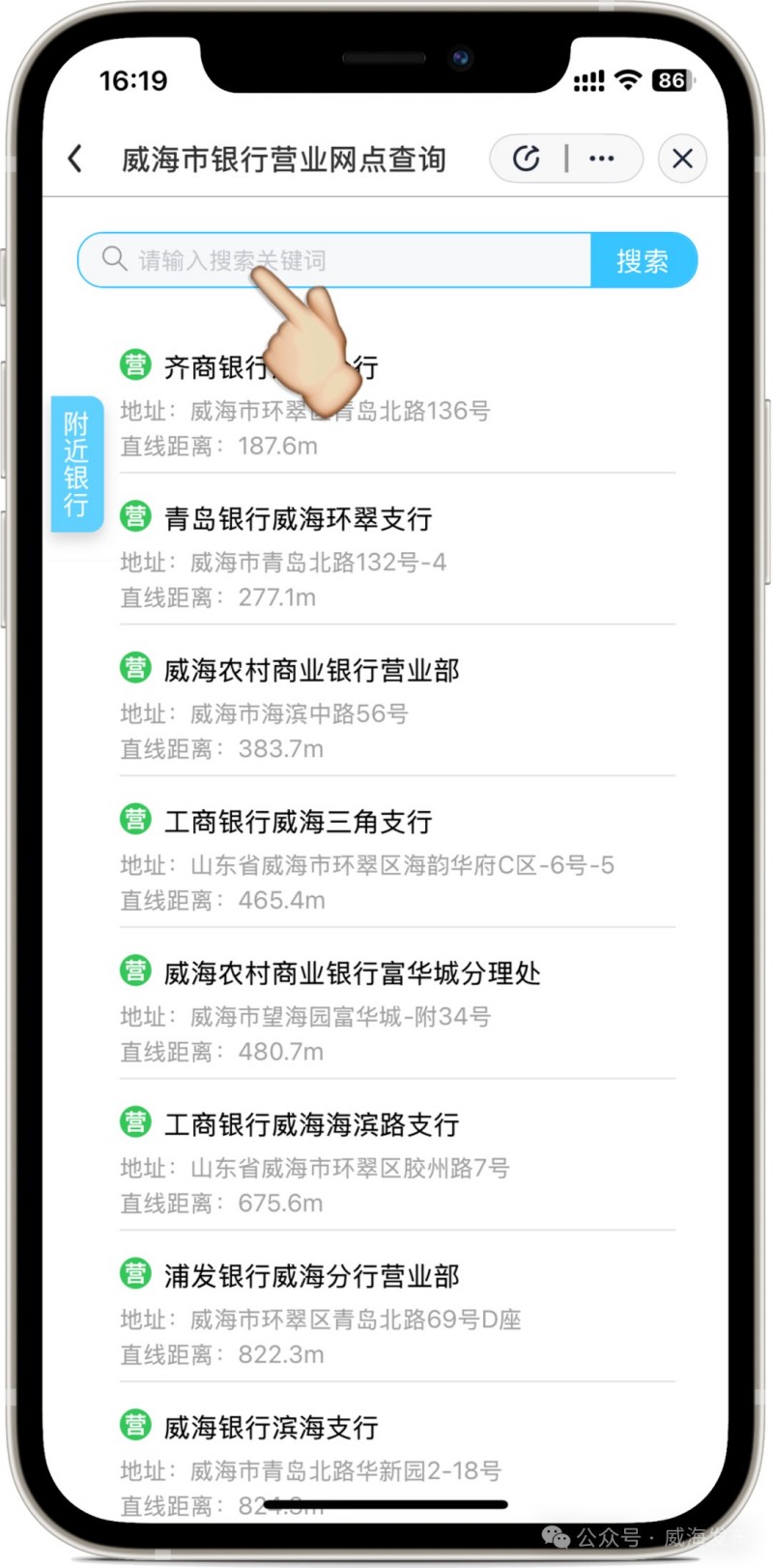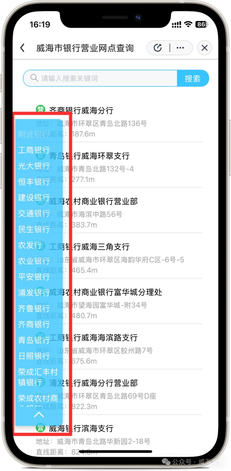 進(jìn)入“愛山東”APP后,在首頁左上角選擇進(jìn)入“威海市”,在搜索框搜索關(guān)鍵詞“銀行營業(yè)網(wǎng)點(diǎn)”,點(diǎn)擊進(jìn)入應(yīng)用。