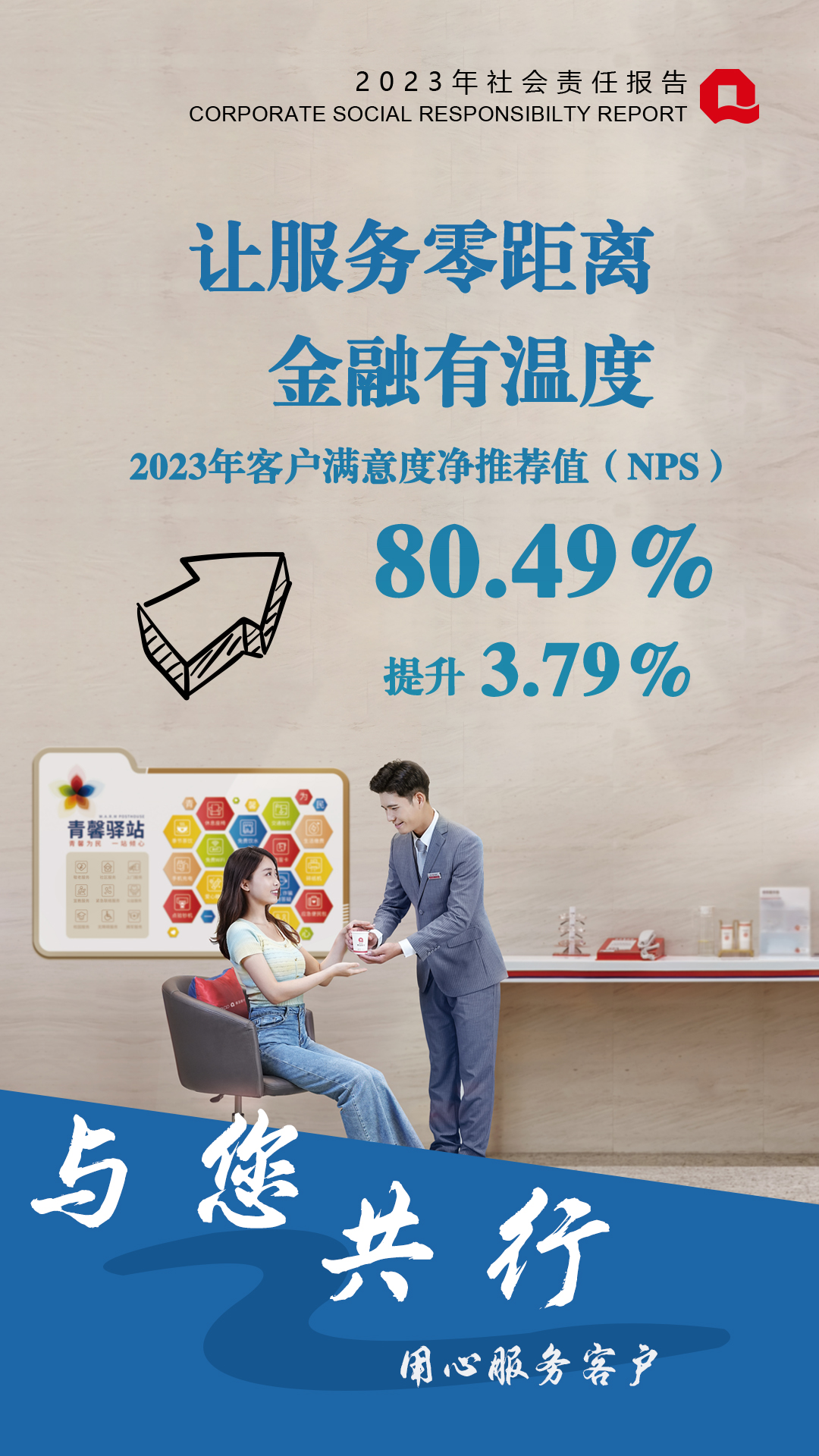 2023年,青島銀行總體客戶滿意度凈推薦值(NPS)達(dá)到80.49%,較2022年提升3.79%。