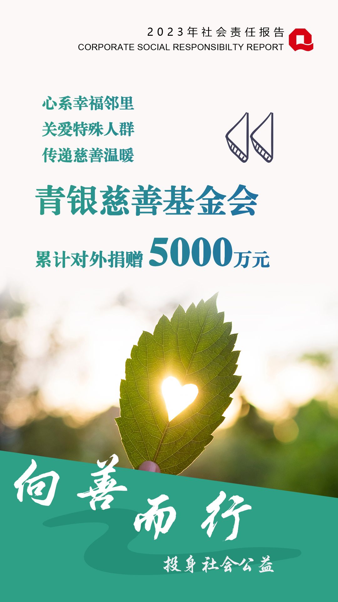 作為地方法人銀行,青島銀行始終秉持回饋社會的理念,積極投身公益事業(yè),不斷書寫“人民金融”的新篇章:“幸福鄰里”深入社區(qū),開展“黨建+志愿”活動718場,讓群眾感受“不一樣”的金融服務(wù),受眾達(dá)5.53萬人;關(guān)愛特殊人群,“青馨服務(wù)”再向前一步,銀發(fā)服務(wù)交出溫情答卷,“青馨工作室”獲中國金融工會“全國創(chuàng)新工作室”命名表彰;青銀慈善基金會傳遞慈善溫暖,積極開展捐資助學(xué)、扶弱濟(jì)貧、綠色公益、美麗鄉(xiāng)村建設(shè)等公益活動。2023年,青島銀行、青銀慈善基金會合計對外捐贈367萬元,榮獲“青島紅十字博愛金獎”、《大眾日報》“2023年社會責(zé)任企業(yè)”榮譽(yù)稱號。